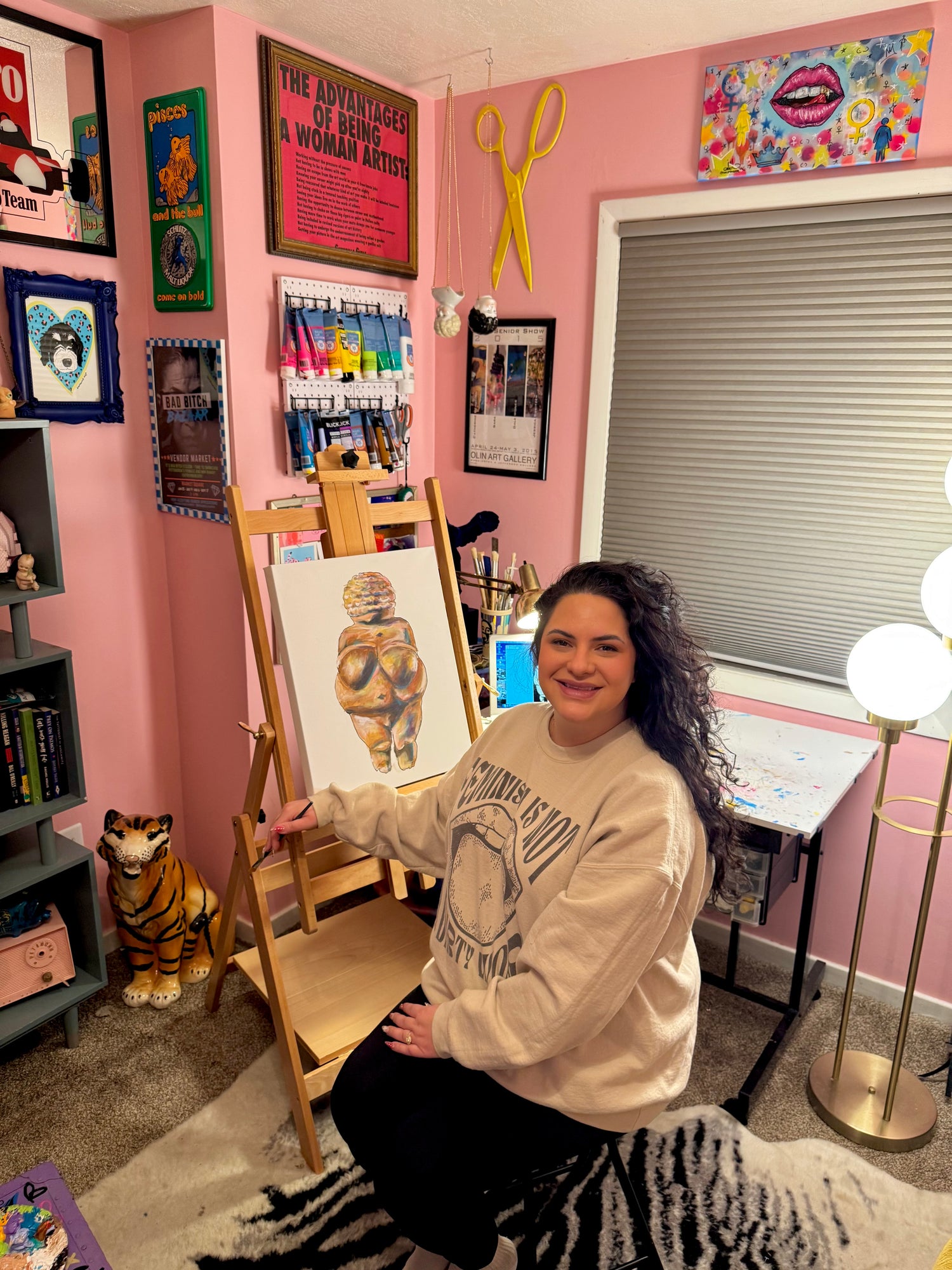Sara Watkins is a Pittsburgh-based artist and the creative force behind SwatShoppe. As a self-proclaimed maximalist, Sara uses bold colors, funky patterns, and impressionistic brushstrokes through her mixed media and painting pieces that often focus on pop culture, feminism, and her community in Pittsburgh.